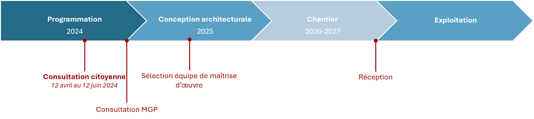 - Lancement de la consultation du marché global de performance pour le choix de l’équipe architecte, bureau d’étude et entreprise générale : fin d’année 2024